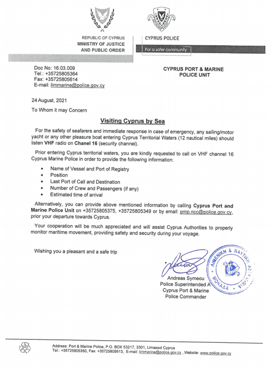 בתאריך 24/8/2021 פרסמה משטרת הנמלים של קפריסין רענון לנוהל הכניסה לאי.