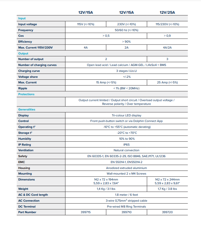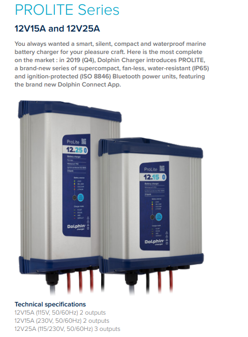 מטען של Dolphin Prolite, הינו קומפקטי, ללא מאורר, עמיד למים בתקן IP25, מוגן הצתה ISO 8846, כולל יחדה המופעלתBluetooth מהנייד ב- “Dolphin Connect” App. הספק צריכה בין 15A ל 25A הופך אותו לאידיאלי לשימוש לכלי שייט כגון יאכטות, סירות דייג סירות עם קונסול מרכזית.